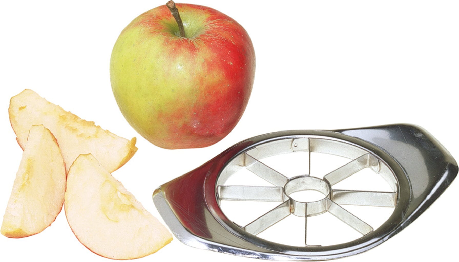 A rozsdamentes acél almavágó gyönyörű, egyenletes méretű almaszeleteket készít.