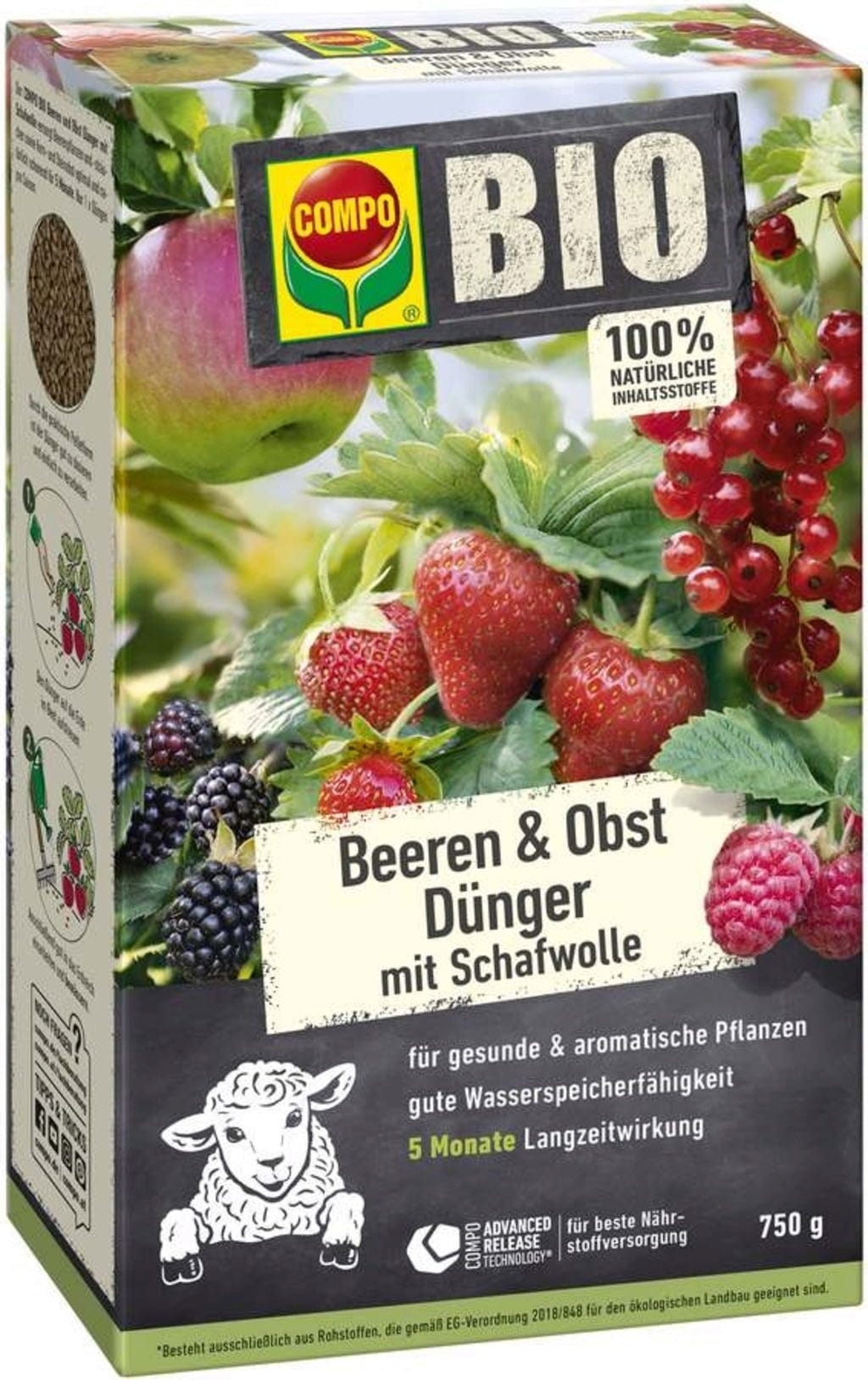 Ezzel a trágyával több hónapon keresztül egyenletesen elláthatja bogyós gyümölcsű növényeit, cserjéit és gyümölcsfáit. A juhgyapjúból származó tápanyagok kíméletesen szabadulnak fel és serkentik a növények növekedését. Ezzel egyidejűleg a duzzasztó hatás gondoskodik a talaj lazán tartásáról és a növények jó szellőzéséről – praktikus módon még a száraz időszakokban is.