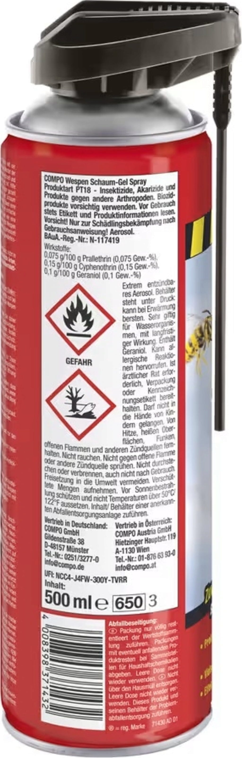 A COMPO darazsak elleni hab-gél spray kifejezetten a darázsfészkek hatékony és ellenőrzött irtására lett kifejlesztve. Az innovatív hab-gél formula megbízhatóan tapad, azonnal hat, és néhány óra elteltével önmagától feloldódik. Ekkor egy hatékony gát jön létre, amely megakadályozza az újbóli fertőzést. A speciális szórófejeknek köszönhetően a nehezen hozzáférhető helyek is biztonságosan és célzottan elérhetők.