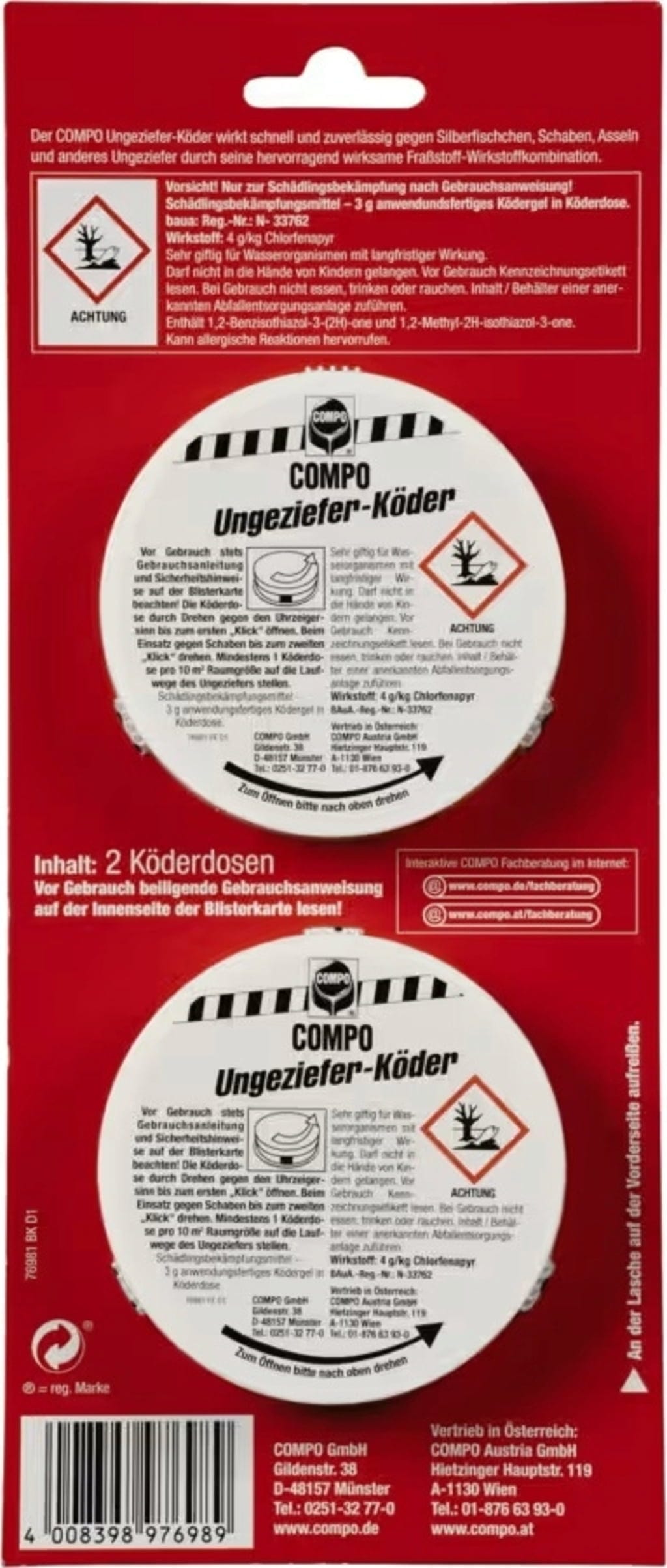 A COMPO kártevő csalétek megbízhatóan gondoskodik a kártevőmentes otthonról. Az újszerű attraktánskombináció célzottan vonzza a kártevőket, és hatékonyan pusztítja el őket – kiszáradás nélkül, még hosszabb ideig tartó használat esetén is. A gyerekbiztos csalétekdoboznak köszönhetően használata különösen praktikus és biztonságos, mind magánterületeken, mind éttermekben vagy üzlethelyiségekben.