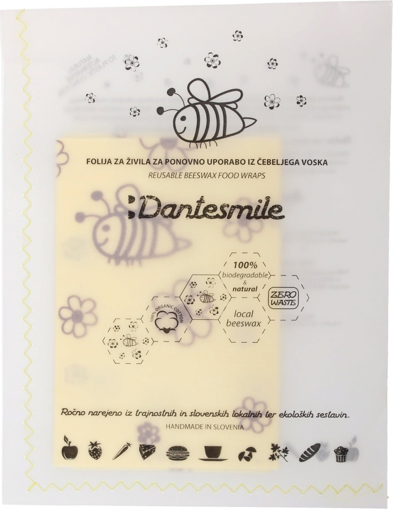 Ettől az aranyos designtól mindenki megéhezik! Ez a nagyszerű méhviasz kendő nemcsak vizuálisan megbabonázó, egyedülálló tulajdonságaival rendkívül meggyőző. 100% természetes bio pamutból készül, amelyet egy minősített szlovén méhészet bio méhviasza borít. A helyi eredetű, kímékletesen válogatott fenyőgyanta biztosítja a kendő szükséges tapadását, azaz, hogy biztonságosan, lezárva ölelje át az ételeket és harapnivalókat, és megbízható módon frissen tartsa. Erről nem utolsósorba természetesen a méhviasz tartalmazott propolisza gondoskodik.