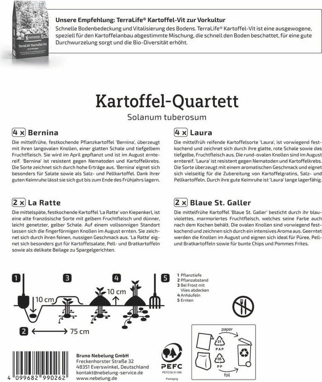 Burgonyakedvelők számára kiváló összeállítás. Négy különböző fajtát (Bernina, Laura, La Ratte és Blaue St. Galler) tartalmaz. A héjuk és húsuk színében, a gumó formájában, valamint főzési módjukban különböznek egymástól. Ideális azoknak, akik szeretnek kísérletezni!