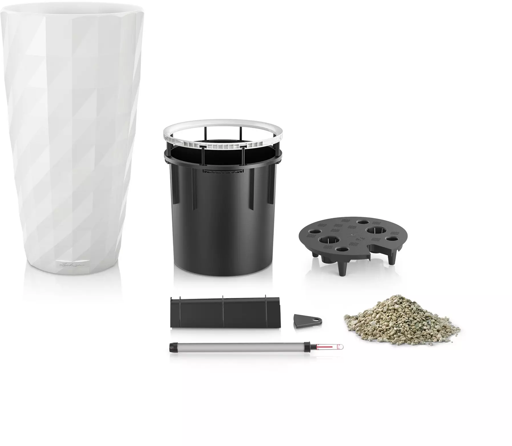 A csomag tartalma: növénytartó + ültetőbetét süllyeszthető hordozófogantyúval (szabadalmaztatott), Lechuza öntözőszett