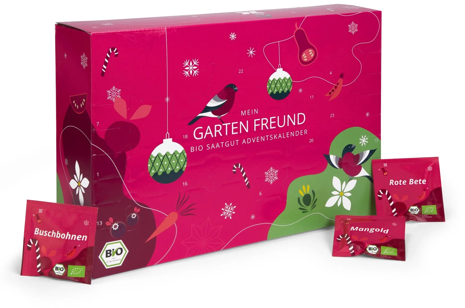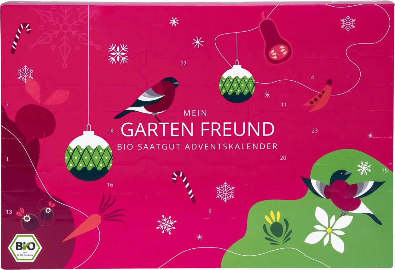 Az adventi naptár 24 különböző bio zöldség- és fűszernövény magot tartalmaz, amelyek akár kis kertekben is termeszthetők, változatosságot kínálva ágyásokba, magaságyásokba, erkélyekre vagy teraszokra. Ezenkívül a magok GMO-mentesek, magas csírázási aránnyal rendelkeznek, és magstabilak.