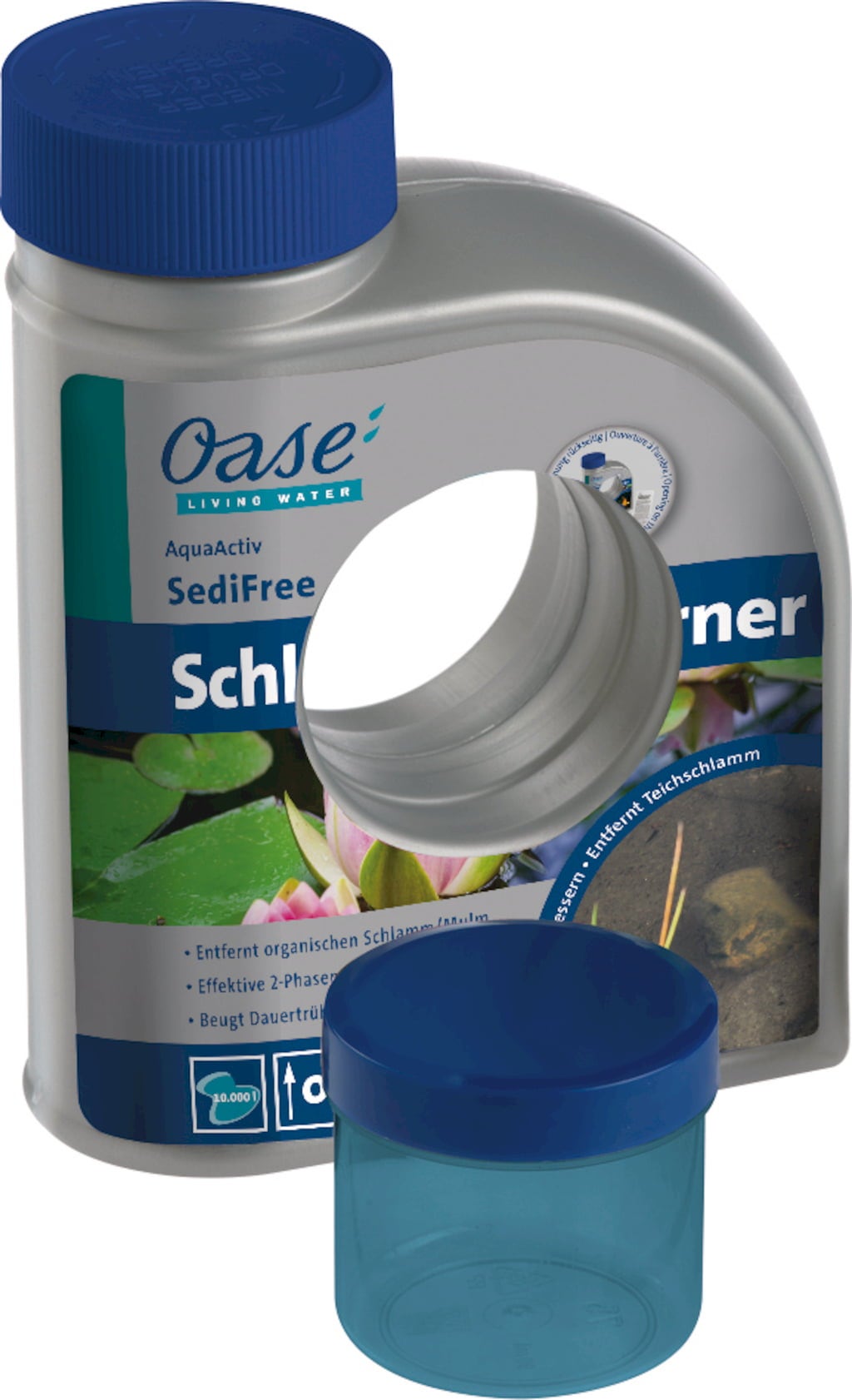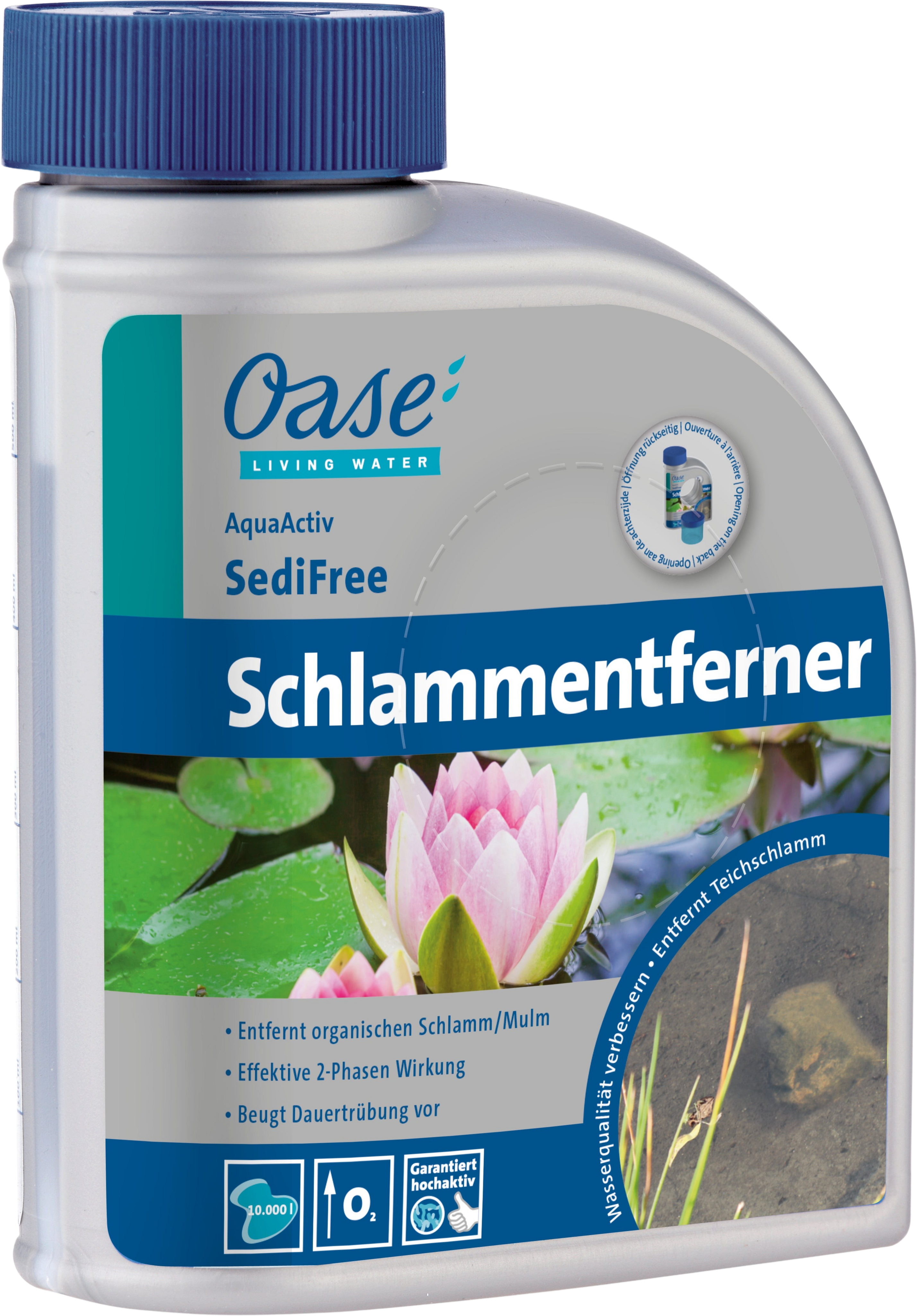 Távolítsa el a már meglévő iszaposodást és akadályozza meg az újbóli kialakulását - Az Oase AquaActiv SediFree hatékony segítő a túlzott iszaposodás ellen, gyenge áramlású tózónákban: a granulátum aktív oxigént és úgynevezett nagy teljesítményű baktériumokat tartalmaz. Mindkét komponens, miután a tó aljára süllyed, aktívvá válik és felgyorsítja az organikus iszap komponenseinek lebomlását. A kerti tó vízújítás nélkül, valamint megelőzve iszapmentes, tiszta és algalerakódás-mentes marad!