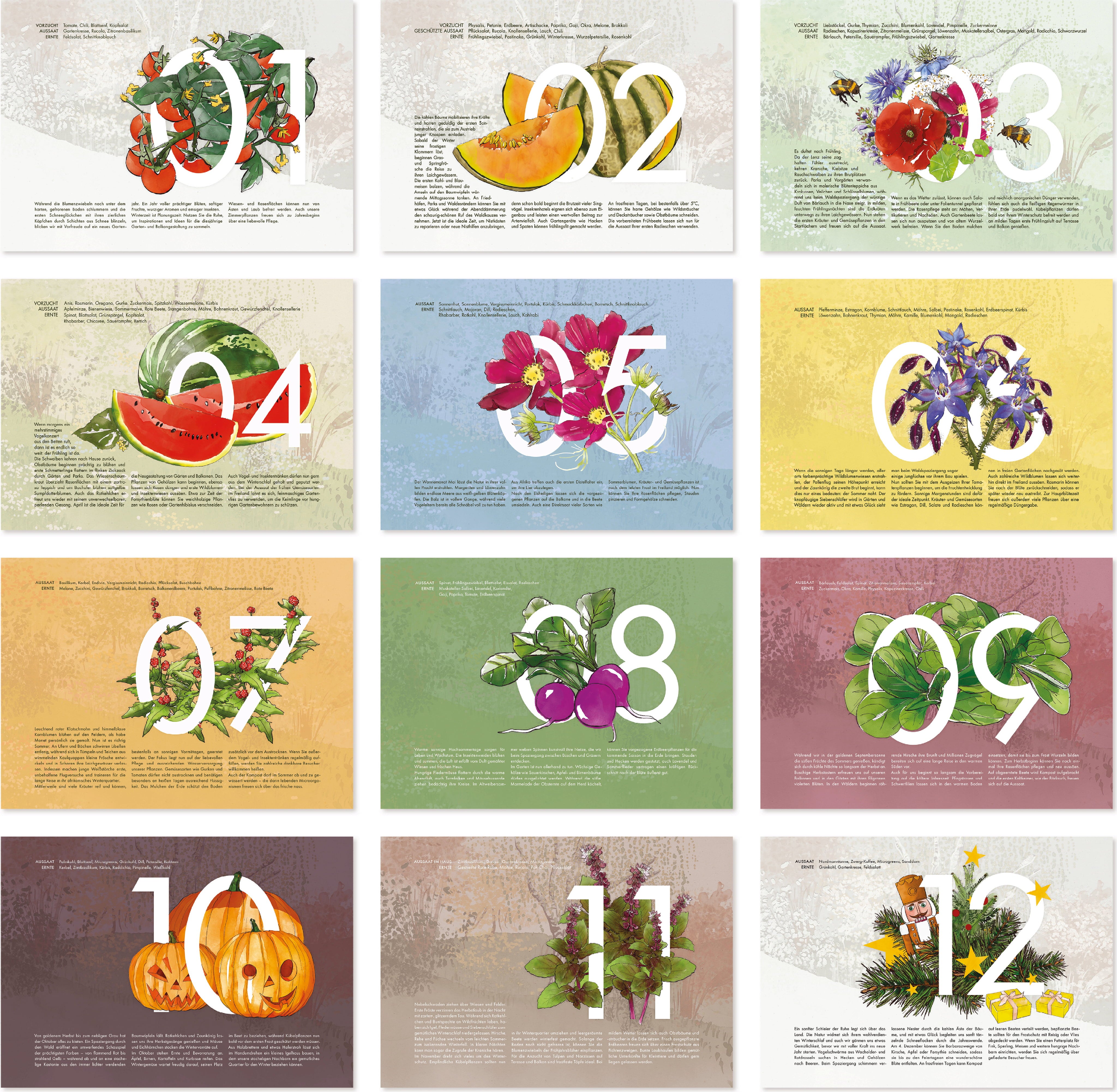Ez a gyönyörűen illusztrált naptár nemcsak személyes találkozóinak ad helyet, minden hónapban két magfajtát kínál. Élvezze az aromás zöldségeket, az illatos fűszernövényeket, az édes gyümölcsöket és a szorgalmasan növő virágokat. Számos fajta közvetlenül is vethető. Rengeteg tipp és információ (nem magyar nyelven) található az adott hónapban várható eseményekről, például a paradicsom ritkításával, a cserjék vágásával vagy a vadvirágok vetésével kapcsolatban. Hónapról hónapra kézen fogva vezeti át tulajdonosát a gyümölcsöző kerti éven.