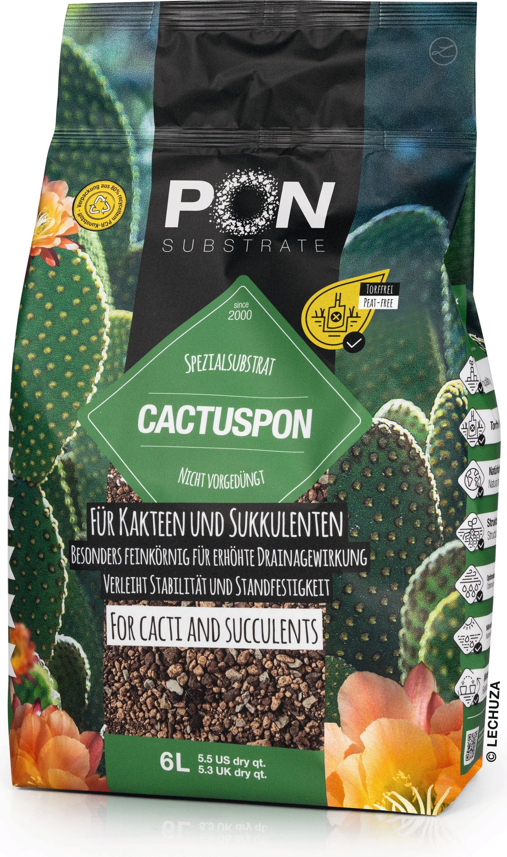 A kaktuszok és a pozsgások a szárazságot kedvelik – a pangó víz a legveszélyesebb ellenségük. A Cactuspon segítségével a természetes élőhelyükhöz hasonló, ideális körülményeket teremthet. A tisztán ásványi speciális szubsztrát finom horzsakőből, lávából és zeolitból áll, amely lehetővé teszi a felesleges víz azonnali elvezetését, és kiváló gyökérszellőzést biztosít. Mivel tudatosan nem előműtrágyázott, Ön teljes mértékben kontrollálhatja növényei tápanyagellátását.