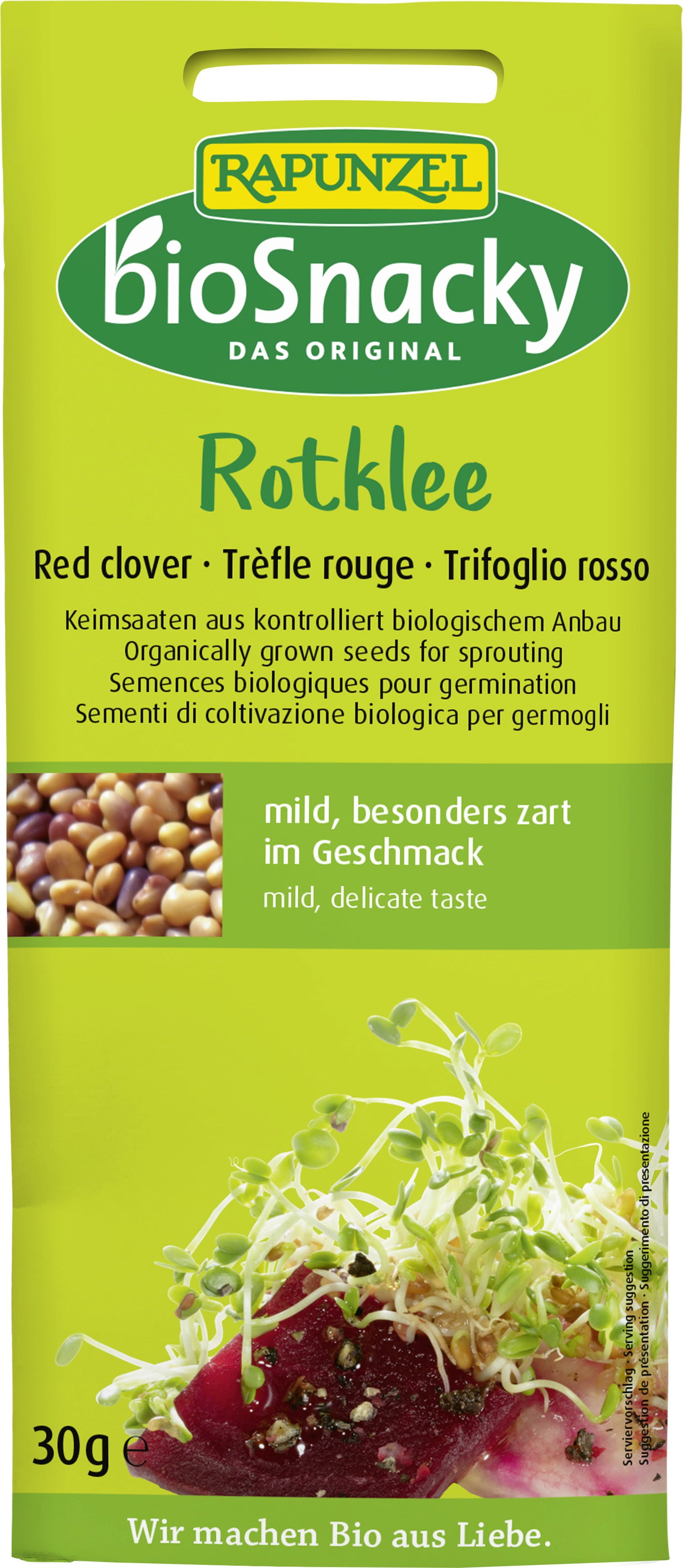 A Rapunzel bioSnacky vörös here-csíra különösen enyhe és lágy ízű. Csírázási ideje három-öt nap. Ezt követően többféleképpen felhasználhatja őket - például salátákhoz, kenyérhez vagy szendvicskrémekhez a legkülönfélébb formákban.
