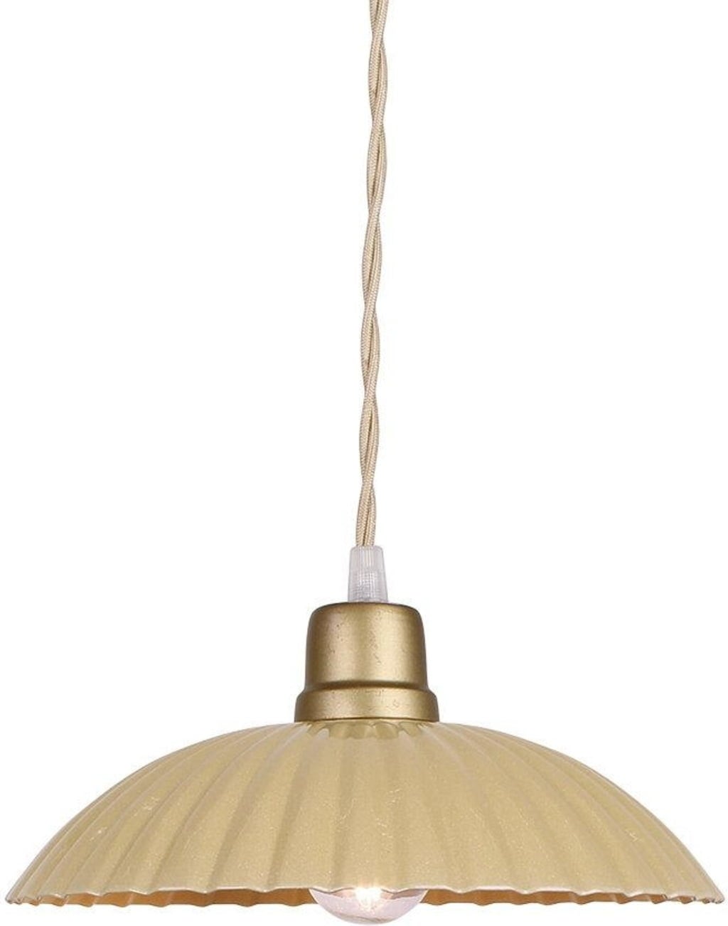 Ez a divatos vintage megjelenésű függőlámpa hangulatos légkört teremt. A kézzel festett fémből készült hullámos lámpabúra, az antik-aranyszínű részek és a bézs textilkábel jelentősen hozzájárul a nosztalgikus varázshoz. Méreténél fogva különösen alkalmas tkezők és konyhaasztalok megvilágítására. Kiváló választás más lámpákkal való kombinációban is.