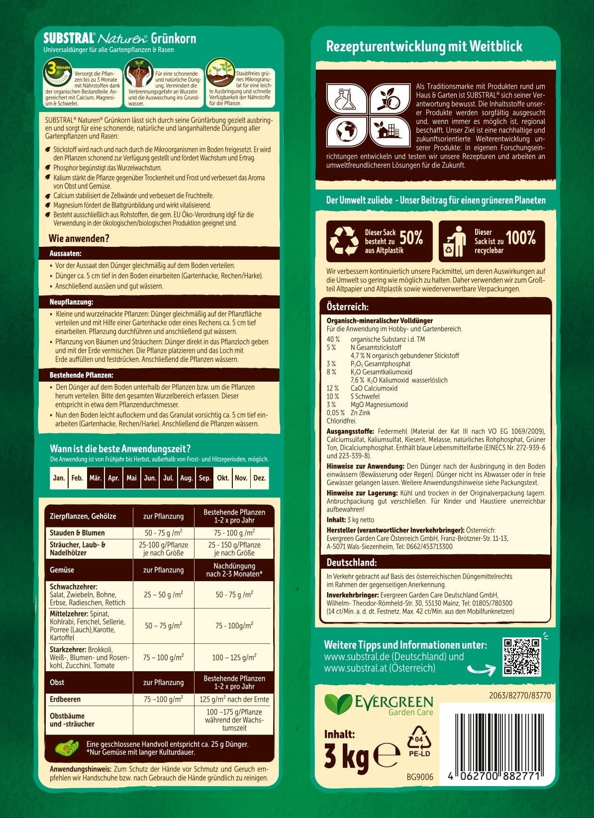Bízzon a SUBSTRAL® Naturen® Grünkorn természetes erejében – ez az univerzális kerti műtrágya minden virágzó, gyümölcs- és zöldségnövényhez, valamint gyepfelülethez alkalmas. A mikrogranulátum biztosítja a műtrágya gyors felszívódását a talajban, az extra magnézium és kalcium pedig elősegíti a pompás zöld színt, valamint a bőséges termés- és virágképződést. A lenyűgöző, akár 3 hónapig tartó hatóidőnek köszönhetően kertje hosszú távon jut hozzá a fontos tápanyagokhoz.
