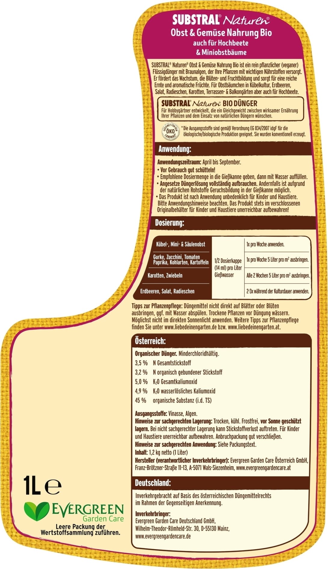 Ez a Naturen folyékony műtrágya szintetikus adalékanyagok nélkül lehetővé teszi a tápanyag-utánpótlást a természettel összhangban. Kiegyensúlyozott tápanyag-összetétel természetes nyomelemtartalommal. A 100% természetes alapanyagokból készült Naturen Bio gyümölcs- és zöldségtáp ideális például dézsás gyümölcsfákhoz, szamócához vagy salátához, retekhez, sárgarépához és egyéb gyümölcs- és zöldségnövényekhez.