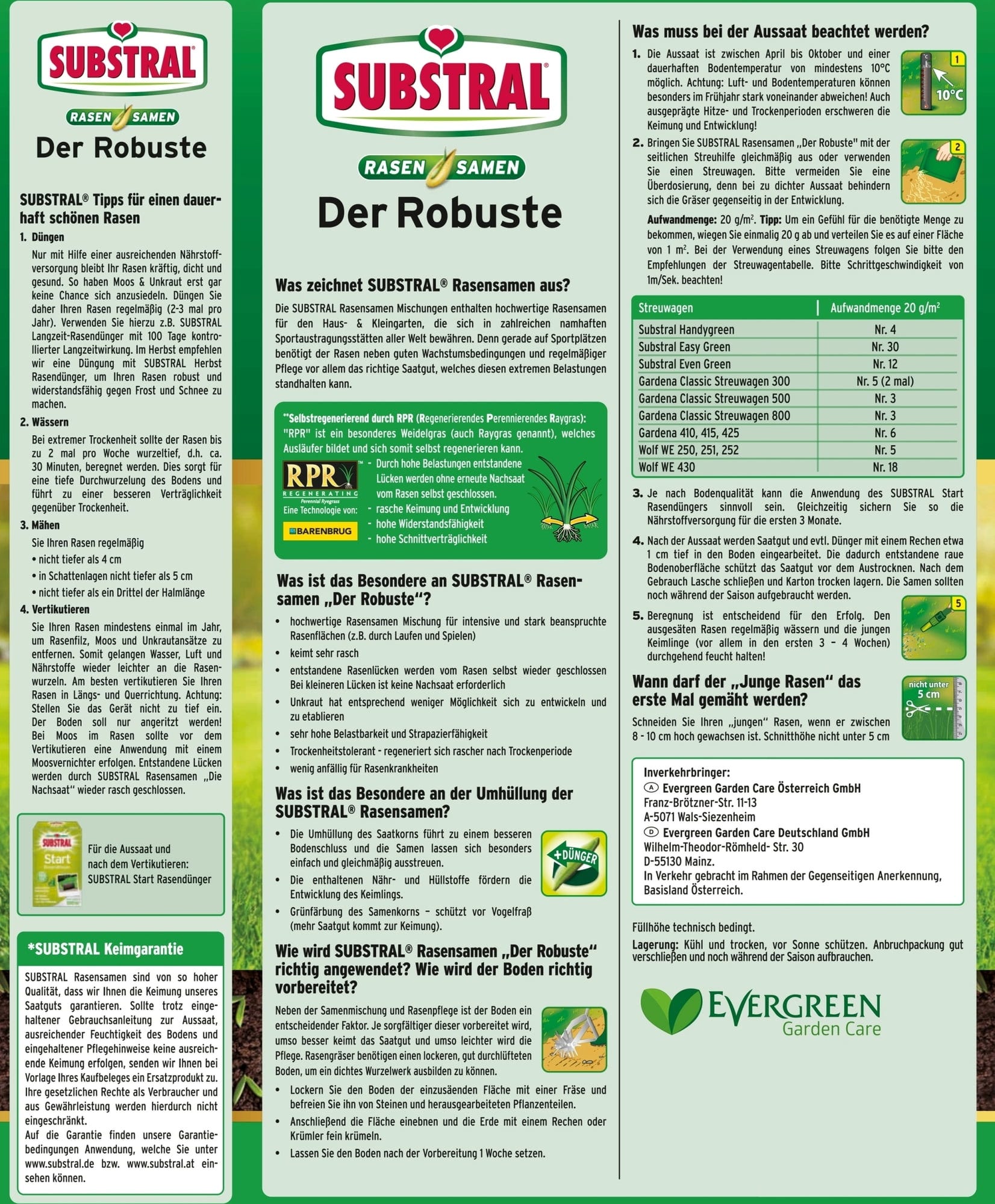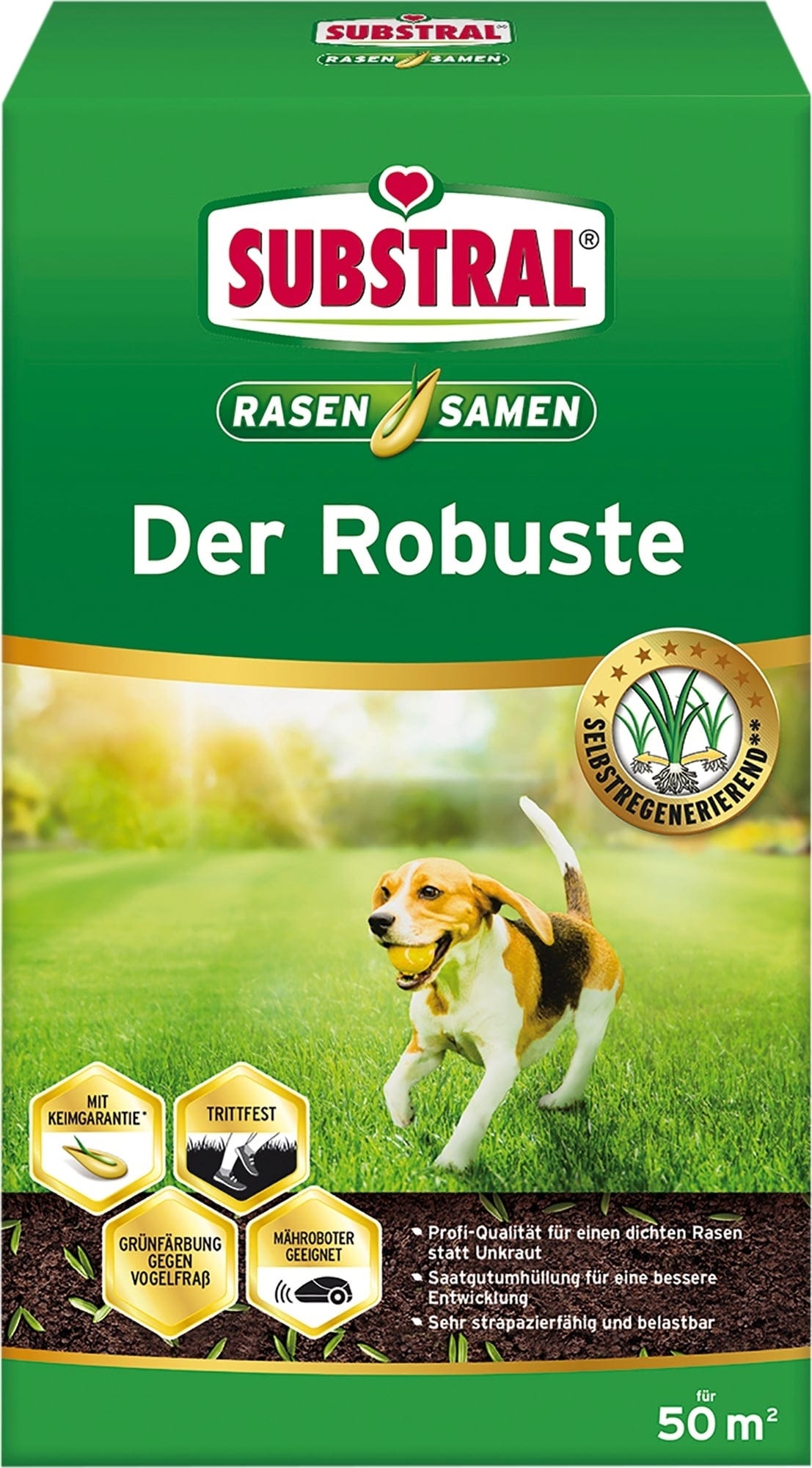 A Substral® der Robuste egy prémium fűmagkeverék intenzív és erősen igénybe vett felületekre. A magok gyorsan csíráznak. A keletkező hiányos foltokat a gyep önmagától benövi. Kisebb hézagok esetén nincs szükség felülvetésre. Így a gyomoknak kevés lehetőségük marad a fejlődésre. Száraz időszak után a gyep gyorsan regenerálódik.
